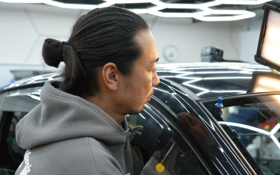 雹害の車もデントリペアで修復できます。内貼りの脱着などかなり手間のかかるパネルで作業時間は比較的長くかかります。鈑金塗装の場合、補修歴や事故歴がついてしまう部分ですのでデントリペアはとても有効な修復手段です。